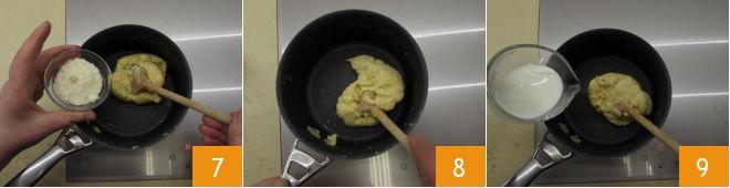 Then add the Parmesan 7 and stir again to melt everything 8. Soften the filling by adding milk 9.