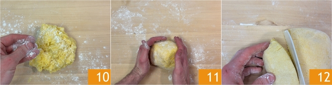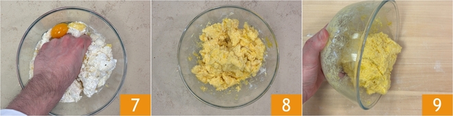 Work the mixture with your hands 7 until the egg is well absorbed 8, then transfer the dough to the work surface 9.
