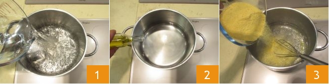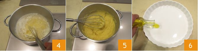 To prepare the polenta quiche, start with the preparation of the base, namely the polenta: put a pot with water on the stove 1, and when it reaches a boil, salt and add about 2 tbsp of oil 2. Then drizzle in the polenta while stirring with a whisk 3