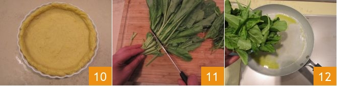 Once you have arranged the polenta 10, let it cool first at room temperature and then in the fridge for about 15 minutes, or until it sets. Meanwhile, move on to preparing the filling: wash the chard and remove the toughest part of the stems 11, then place them in a pan where you have added about 4 tsp of oil 12.