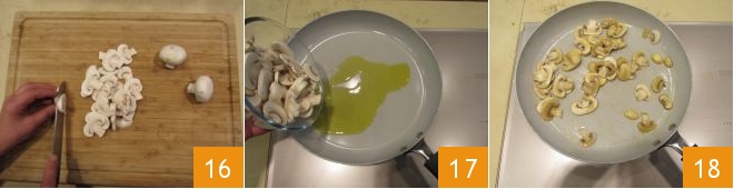 then slice them about a quarter-inch thick. Pour about 2 tsp of oil into a pan and add the mushrooms 17, which should cook for a maximum of 2-3 minutes 18. When the mushrooms are cooked, set them aside on a plate.