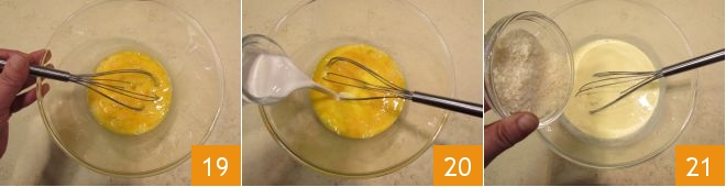 In a bowl, beat the eggs with a whisk 19 and, still mixing with a whisk, add the fresh liquid cream 20 and grated Parmigiano cheese 21.
