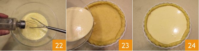Add a pinch of salt and pepper to taste 22. At this point, take the pan with the polenta and pour in the mixture of fresh cream and eggs 23, carefully filling the polenta base 34.