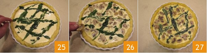 Place the chard overlapping and crossing them, as if to create a lattice pattern 25, then place the mushrooms in the empty spaces between the chard leaves 26. Bake in a preheated static oven at 356°F for about 40 minutes, and once baked, serve: your polenta quiche is ready to be enjoyed 27!