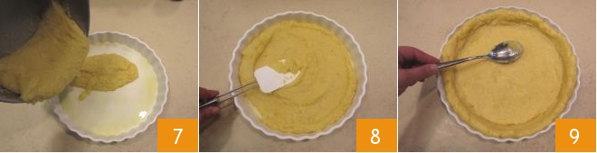 and pour the polenta into it 7, spreading it on the bottom and sides using a spatula or spoon to compact it well (8-9).