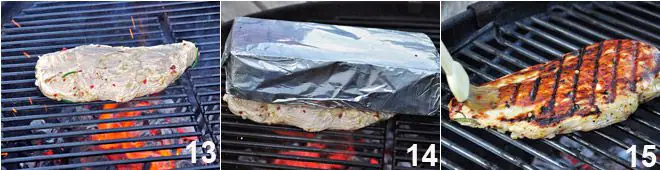 Once the necessary time has passed, pat the marinade off the chicken breast and place it on the grill 13 and put the weight on top 14. Lower the flame under the chicken and cook for about 5 minutes. Remove the brick, rotate the chicken 90°, replace the brick, and cook for another 5 minutes. Remove the brick again, brush with the remaining marinade 15, flip the chicken, and put the brick back. Cook in the same way as the previous side. Once cooked, plate and decorate the dish with a sprig of rosemary.