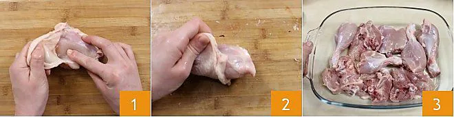 To prepare tandoori chicken, start by removing the skin from the drumsticks and chicken thighs (1-2); alternatively, you can use other preferred chicken pieces like breasts or wings. Once skinned, place the chicken in a wide, shallow container 3.