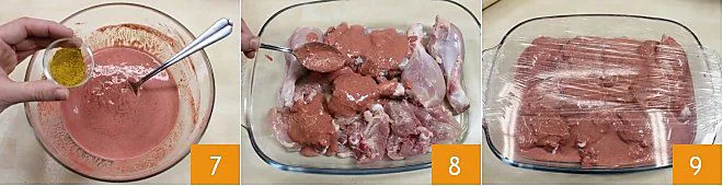 Finally, add the curry and adjust the salt if necessary 7 then mix well and pour the marinade over the chicken 8, which should be completely covered by it. Cover the bowl with plastic wrap and leave it in the refrigerator to marinate for 34 hours 9.