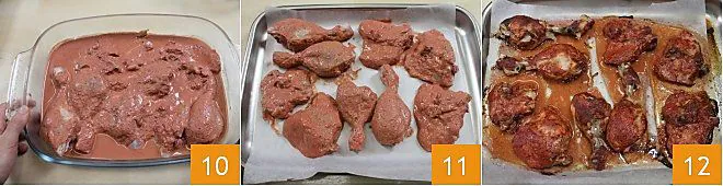 After this time, take the chicken 10 and place the pieces on a baking tray lined with parchment paper, well spaced apart 11. Bake in a static oven preheated to 450°F for 40 minutes (or 400°F for 35 minutes in a fan-assisted oven). Remove the crispy tandoori chicken from the oven 12, take it off the tray, and serve it on a bed of salad or with pilaf rice!