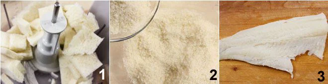 To prepare codfish balls, first desalinate the cod by rinsing it well under running water and soaking it for two days in cold water, changing the water at least twice a day. Meanwhile, place the breadcrumbs in a mixer 1, blend it finely, and put it in a bowl 2. After two days, dry the cod well 3