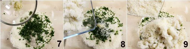 In a large bowl, place the chopped breadcrumbs, parsley, thyme, garlic 7, cod 8, and finally the grated Parmesan cheese 9.
