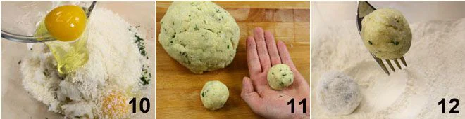 Then add two eggs 10 and season with salt and pepper. Mix well to combine everything into a compact dough. With your hands, form small balls from the mixture 11 and place them on a tray. Prepare three bowls: one for the flour, one for the breadcrumbs, and one for a beaten egg. Roll the balls first in the flour 12,