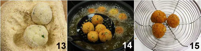 then in the beaten egg, and finally in the breadcrumbs 13. Fry the balls in hot vegetable oil 14. When the balls are golden, drain them with a slotted spoon and place them on paper towels 15 to absorb the excess oil.