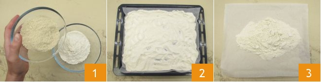 To prepare the polvorones, first combine the all-purpose flour and almond flour in a bowl 1, mix well and spread the mixture on a baking sheet lined with parchment paper 2. Toast the flours in a preheated fan oven at 266°F for about 20 minutes, then remove and let cool for at least 30 minutes 3. If your oven fan is too strong, to prevent them from dispersing, you can toast the flours in a static oven at the same temperature.