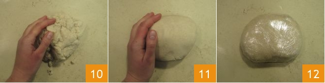 Transfer the obtained mixture to the work surface and start working it with your hands 10: being egg-free, the mixture will initially be difficult to compact, but you will eventually manage to obtain a smooth and uniform dough 11. Wrap the dough in plastic wrap 12 and let it rest at room temperature for 20 minutes.