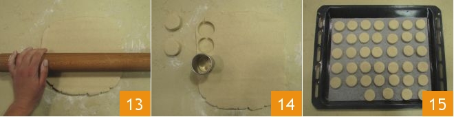After the resting time, roll out the dough to a thickness of about 3/8 inch 13, then cut out the cookies using a round cookie cutter with a diameter of about 1 1/2 inches 14. Gently place the cookies on a baking sheet lined with parchment paper 15 and bake in a preheated static oven at 320°F-338°F for about 20 minutes, placing the tray on the middle rack.