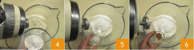 Once cooled, transfer the toasted flours to the bowl of a stand mixer (or a large bowl if working by hand), then add the powdered sugar 4, the salt 5, and a pinch of ground cinnamon 6;