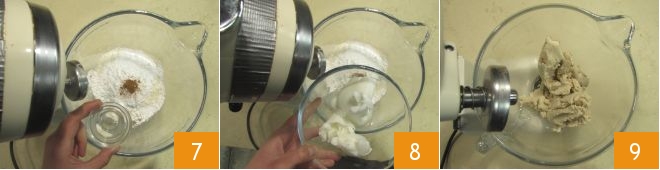 also pour in the anise liqueur 7 and the cold lard (alternatively, as indicated in the advice, you can use butter) 8 and mix with the paddle attachment until the ingredients are combined 9.