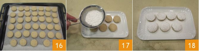 Once baked, the cookies will still be a bit soft, so that touching them with your fingertip will leave some dough on it: don’t worry, they will firm up once cooled 16. After letting them cool, dust with plenty of powdered sugar 17 and serve the polvorones to your guests 18 or wrap them in tissue paper to give to your friends as a gift!