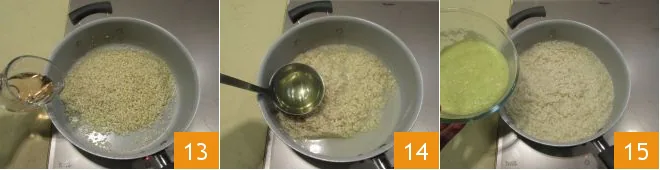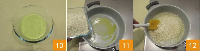 Then set the leek cream aside 10. Now move on to the rice: in a large pot, heat the oil, add the rice 10 to toast it over medium heat, stirring to prevent sticking 12.