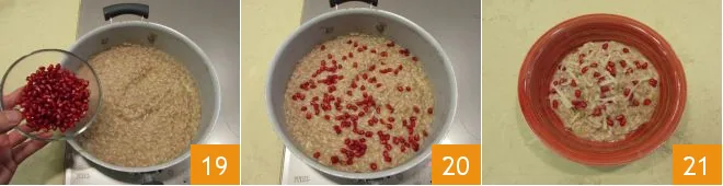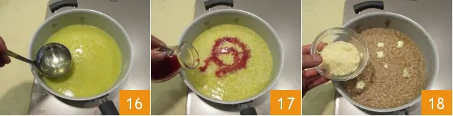 Pour in 1 or 2 more ladles of vegetable broth 16, and when it is slightly absorbed, pour in the pomegranate juice 17 and stir, continuing to cook. Turn off the heat and add the butter in small pieces and the grated Grana Padano PDO 18, stirring to mix.