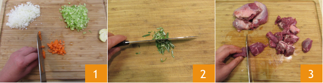 To make the cheeks with polenta, first clean and finely chop the vegetables (carrot, onion, and celery) and the garlic for the sauté 1. Also, chop the rosemary 2 and cut the pork cheeks into bite-sized pieces 3.