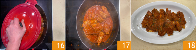 Cover with the lid 16 and cook on low heat for about 2 hours, stirring occasionally 17. At the end of cooking, the meat should be so tender it falls apart and the sauce should be nice and thick. Your pork rib sauce is ready to be enjoyed as you like 18!