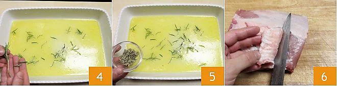 the rosemary 4, the oregano 5, finally season with salt and pepper. Now focus on the meat. Take the pork loin, remove the fatty part with a sharp knife 6,