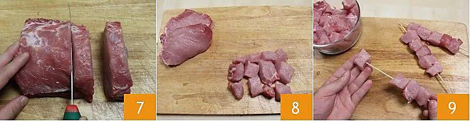 cut slices about three-quarters of an inch thick 7 and then cut these into cubes about 3/4 inch by 3/4 inch 8, each piece should weigh about 0.5 oz. Then thread the meat cubes onto 8-inch wooden skewers 9. Each skewer can hold 5 pieces of meat, and with these quantities, you will obtain 12 skewers.
