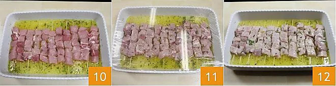 Place the pork souvlaki in the previously prepared mixture 10, cover the dish with plastic wrap 11 and refrigerate to marinate for at least 30 minutes. After the necessary time, remove the dish from the fridge 12