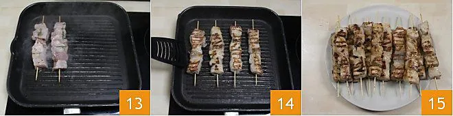 and proceed with cooking: place a cast iron grill on the stove and heat it well, grill the skewers making sure to cook them on each side 13. The inside of the meat should be tender yet well-cooked, and the outside should have the typical grill marks 14, which will take about 15 minutes. Serve the pork souvlaki 15 while still hot, accompanied by tzatziki and the typical Greek salad.