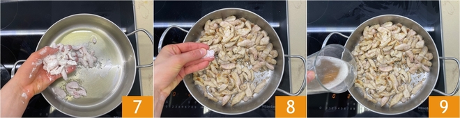 Remove excess flour from the strips and transfer them to the saucepan 7. Salt 8, brown well, and deglaze with the beer 9.