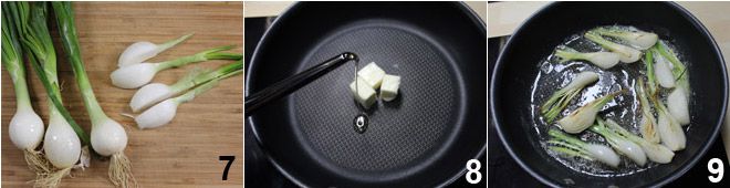 Now clean the scallions and cut them into quarters 7. Stew them in a non-stick pan with butter and oil, salt them and keep them on the fire until golden (8-9).