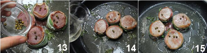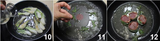 At this point, deglaze with white wine 10. Once the wine has evaporated, turn off the heat and keep them warm. In a non-stick pan, place the butter, a drizzle of oil, and the rosemary sprigs 11. Lay the tenderloins and brown them well on both sides 12.