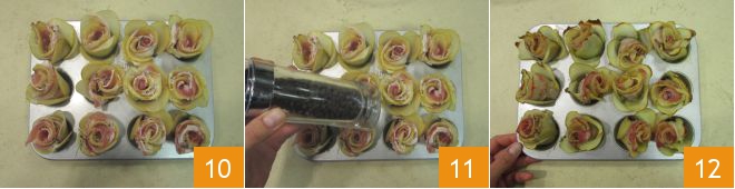 As you form the little roses, place them into a mini muffin tin 10, drizzle with some oil and pepper 11, and bake in a preheated static oven at 392°F for 20 minutes. Once cooked, take the potato and bacon roses out of the oven and let them cool slightly before enjoying them 12.