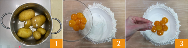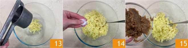 Meanwhile, the potatoes will be ready, so pass them through a potato ricer and collect them in a large bowl 13. Salt 14, pepper, and add the chopped onions 15.
