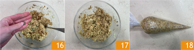 Flavor with thyme leaves 16 and mix the mixture 17, then transfer it to a piping bag without a nozzle 18.