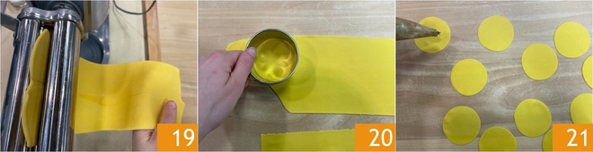 Now take back the dough, divide it into smaller portions, and roll it out with a pasta machine starting from the widest thickness down to the penultimate (about 1/16 inch) 19. Give some folds to the sheets when moving from one roller to another to give more strength to the dough. Lay the sheets on the work surface and cut out discs with a cookie cutter with a diameter of 2.75 inches 20. You can knead and roll out the scraps again to make more ravioli. Squeeze a dollop of filling in the center of each disc 21, then spray them with a little water to facilitate sealing.