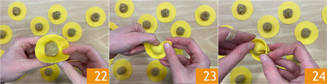 Fold each disc in half to form a half-moon 22, then press the edges well to seal, taking care to expel all the air. Finally, close the ravioli by gently pushing with your thumb inward 23 and pinching the ends together 34. Continue this way to form all the ravioli; with these quantities, you will get about fifty.