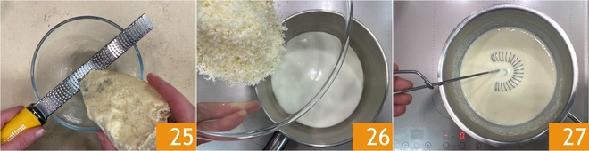 At this point, prepare the fondue: grate the castelmagno 25. In a saucepan, pour the cream and grated cheese 26, then heat over very low heat for about ten minutes until melted, stirring occasionally with a small whisk 27.