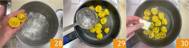 You are ready to cook: bring a pot of salted water to a boil, drop in a few ravioli at a time 28 and cook for 2-3 minutes. Drain the ravioli in a pan, then add a ladle of their cooking water 29 and the butter 30.