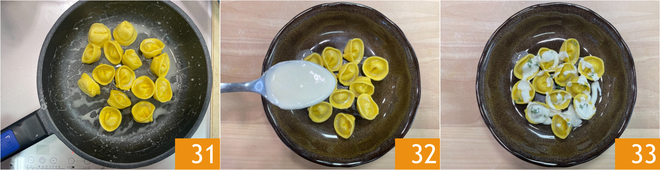Toss gently off the heat 31, then plate. Complete the dish with the castelmagno fondue 32 and a few thyme leaves. Your potato and onion ravioli with cheese cream are ready to be served 33!