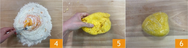Start incorporating the flour by beating the eggs with a fork 4, then help yourself with a scraper and finally knead with your hands until you obtain a compact, smooth, and homogeneous dough 5. Wrap the dough in plastic wrap and let it rest in the fridge for at least 20 minutes 6.