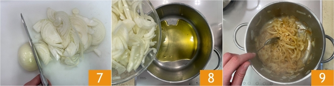 In the meantime, take care of the filling: peel the onions and cut them into julienne strips 7, then pour them into a saucepan where you have heated a drizzle of oil 8. Sauté over high heat, stirring often 9.
