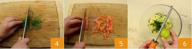 Chop the dill with a knife 4 and cut the smoked salmon into strips 5. Add the chopped dill to the bowl with the potato puree, season with salt and pepper, and add the grated lime zest 6.