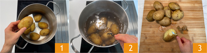 To prepare the potato and tuna salad, first place the potatoes in a pot 1, cover them with water, and once it reaches a boil, cook for 40 minutes. Use a fork test 2 to check if they are cooked. Let them cool slightly and remove the skin 3.