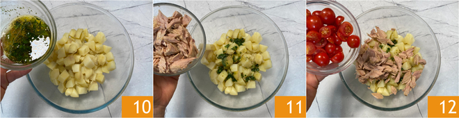 Place the potatoes in a bowl, add the flavored oil 10, the tuna 11, and the cherry tomatoes 12.
