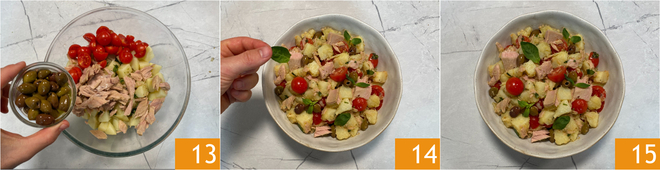 Add the Taggiasca olives 13 and mix thoroughly, then let rest in the fridge for at least 30 minutes. Plate and finish with basil leaves 14. Your potato and tuna salad is ready to be enjoyed 15.