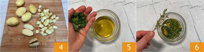 Cut them into cubes of about 1.5-2 cm 4 (about 3/4 inch). At this point, prepare the aromatic oil. In a small bowl, pour the oil, add the basil 5, torn by hand, and the thyme 6.