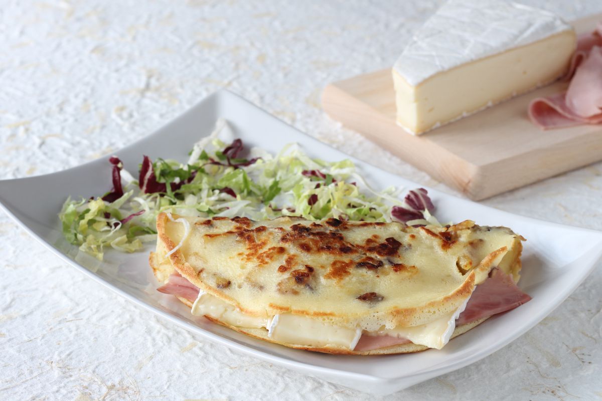 and the brie 19. Fold the crepe over the filling 20. Transfer the crepe to a plate and continue with the remaining batter, remembering to always grease with some butter for subsequent cooking. Serve the potato crepes with brie and ham hot, accompanied by fresh salad 21.